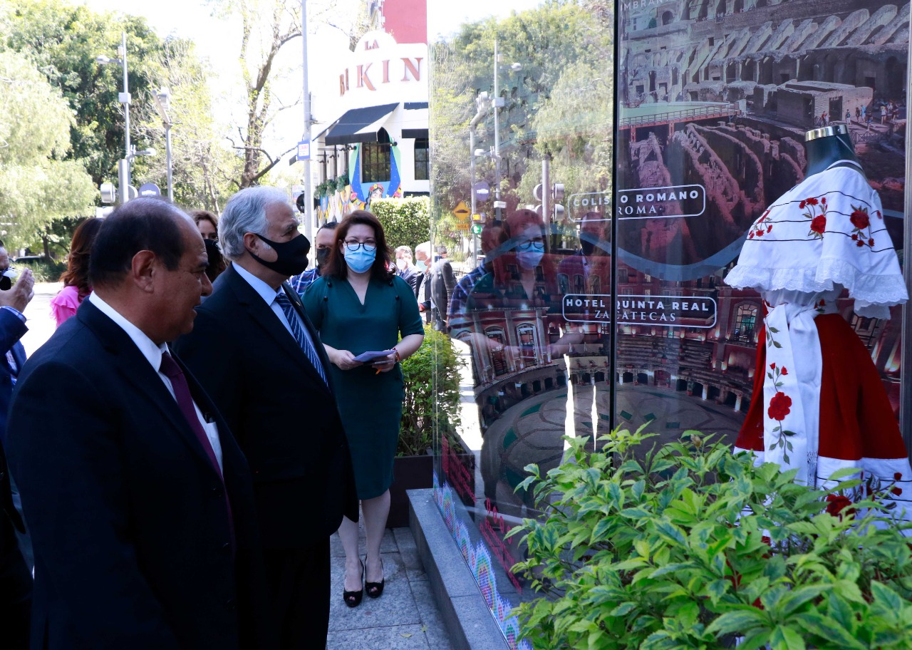 En la inauguración de la exposición “Sabor, Tradiciones y Cultura Zacatecas Deslumbrante”, acompañaron al secretario de Turismo, María Teresa Inguanzo González, subsecretaria de Promoción Turística de Zacatecas, así como Gloria Garza de Torruco, esposa del secretario de Turismo, quienes hicieron un recorrido por los diferentes espacios de la muestra artesanal.
