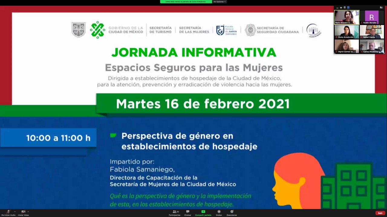 A través de la Jornada Informativa virtual “Espacios seguros para mujeres” las Secretarías de Turismo, Mujeres, Seguridad Ciudadana, el Consejo Ciudadano para la Seguridad y Justicia de la Ciudad de México, y la Fiscalía capitalina abordarán temas con perspectiva de género en establecimientos de hospedaje.